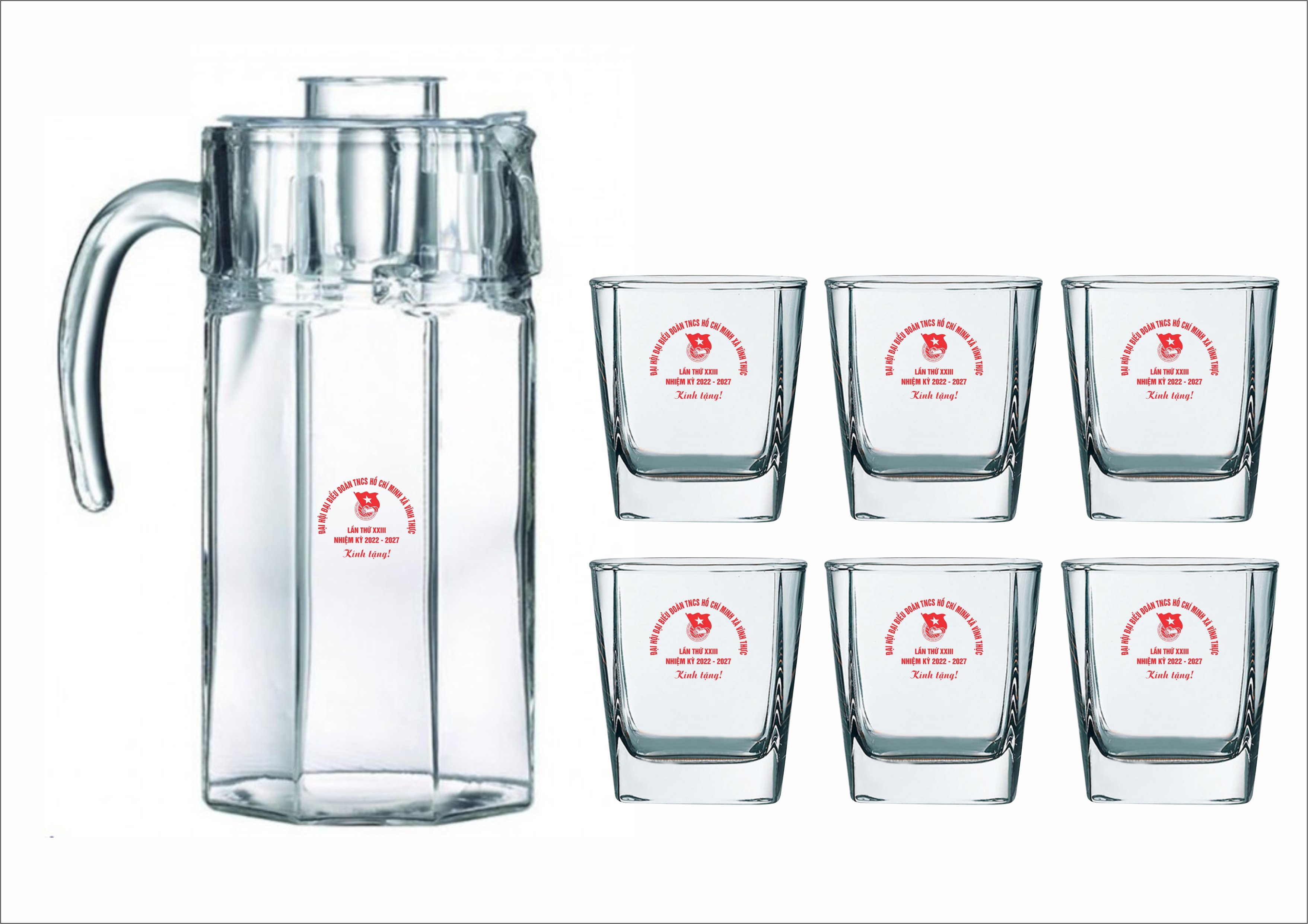 Bình thủy tinh với thiết kế kiểu dáng sang trọng, thanh lịch có thể dùng để làm quà tặng đại hội trong mặt trận. Có hai lựa chọn để bình thủy tinh 6 ly kết hợp In logo theo yêu cầu.